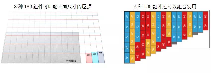 從鋪滿屋頂最大化安裝容量的角度,三種尺寸的166組件可以滿足不同應用場景的需求;此外由于工作電流一致,三種166組件還可以組合使用,進一步提高屋頂的利用率,詳見下圖。