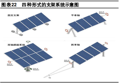 光伏支架可主要分為固定支架及跟蹤支架,固定支架主要包括最佳傾斜角固定式以及固定可調式。跟蹤支架主要包括平單軸、斜單軸和雙軸支架,可使光伏組件全天跟隨太陽位置運動,減小太陽光的入射角度,提高光伏組件對太陽能的吸收率。