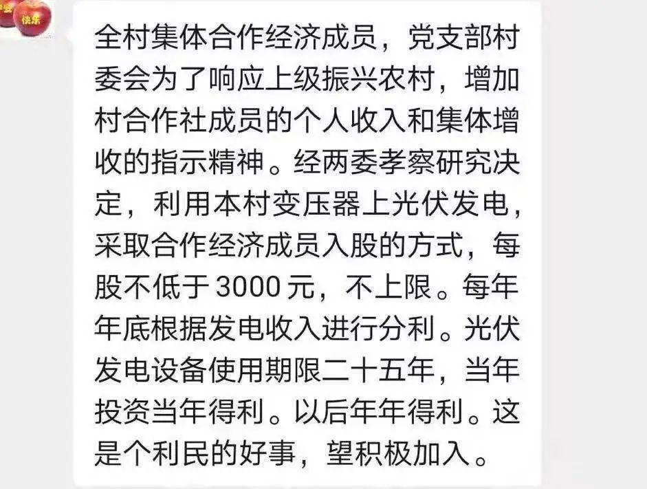 最近,有朋友發(fā)了一張圖,說(shuō)他們村開(kāi)始通知村民集資建光伏電站了,然后年底進(jìn)行分紅。一時(shí)間來(lái),老百姓的投資意識(shí)又提高了,開(kāi)始集資建光伏電站了。